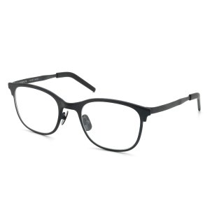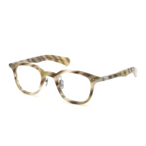 板状の金属の表面には丁寧にヘアラインを施し、テンプルの先で色を反転させたバイカラーをビンテージのセル生地で覆う。 工業的な素材感にビンテージ生地を掛け合わせることで、味がありながら単調で綺麗なバランスを生み出しました。