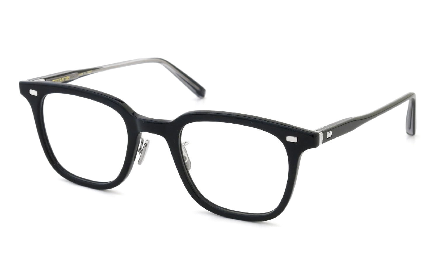 このモデルのアイコンとなるフロントとテンプルの合い口部に設けられた特殊な形状を持つ丁番と 平座金はヴィンテージのフライトジャケットのジッパ一部から着想を得たもの。平座金をかませることで広い面積で丁番へカが作用するため、緩みにくいという機能的な利点がある。EYEVAN 7285のスタンダードともいえるスクエアウェリントンにサンプラチナの角丸四角型の飾りカシメ金具がほどよいアクセントになった。