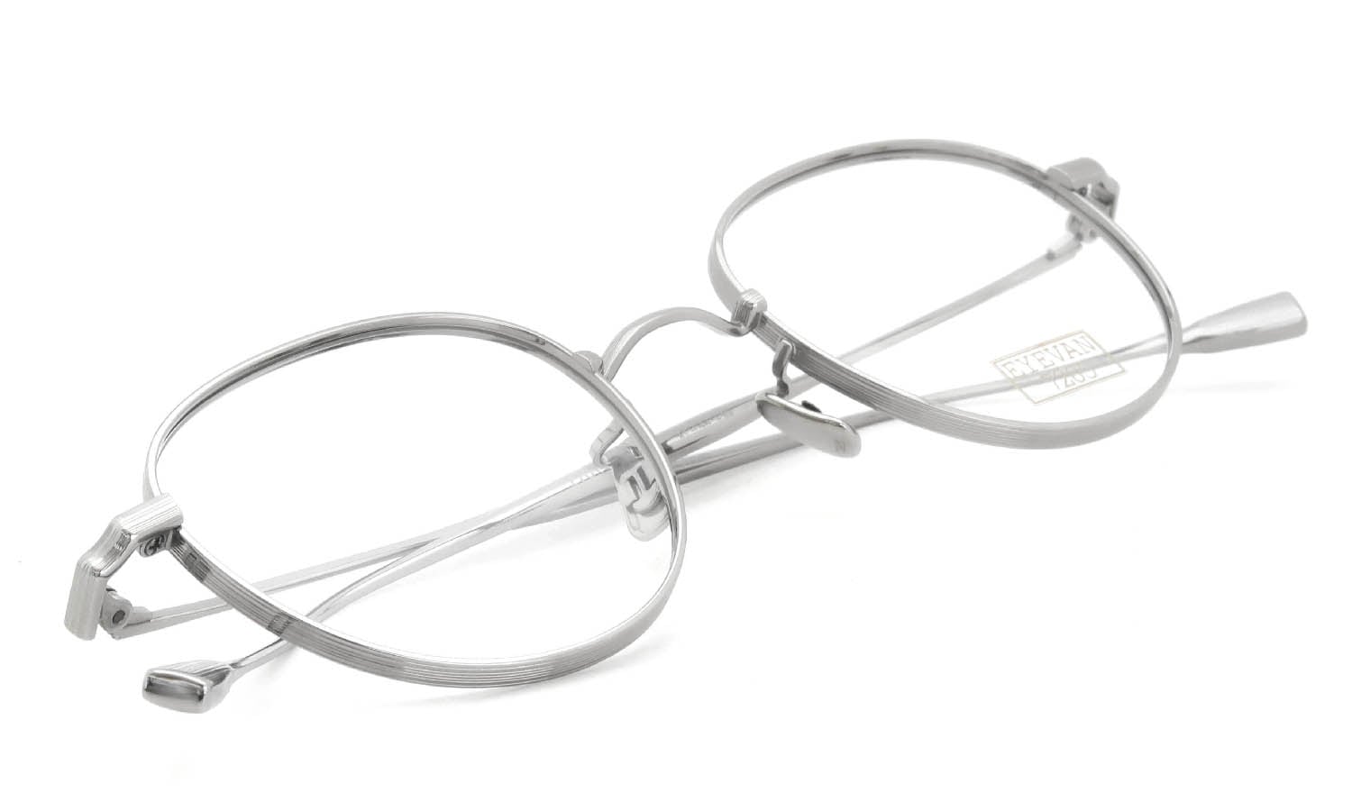 フロントリム、ブリッジ、智、テンプルのすべてにEYEVAN 7285 アルミケースに用いられている 通称 [EYEVAN 7285 ストライプ ]を配したミニマムなメタルフレーム。 初代 EYEVANの立ち上げに携わった当時のデザインチームから譲り受けたヴィンテージのコンパクトなアルミケースに刻まれた 特殊なピッチのストライプから着想を得たこのストライプもEYEVAN 7285 の重要なアイコン的モチーフの一つ。 今回このモデルのために全てのパーツを型から作製した。 47 サイズのRXと 49 サイズのサングラスバージョンで展開。