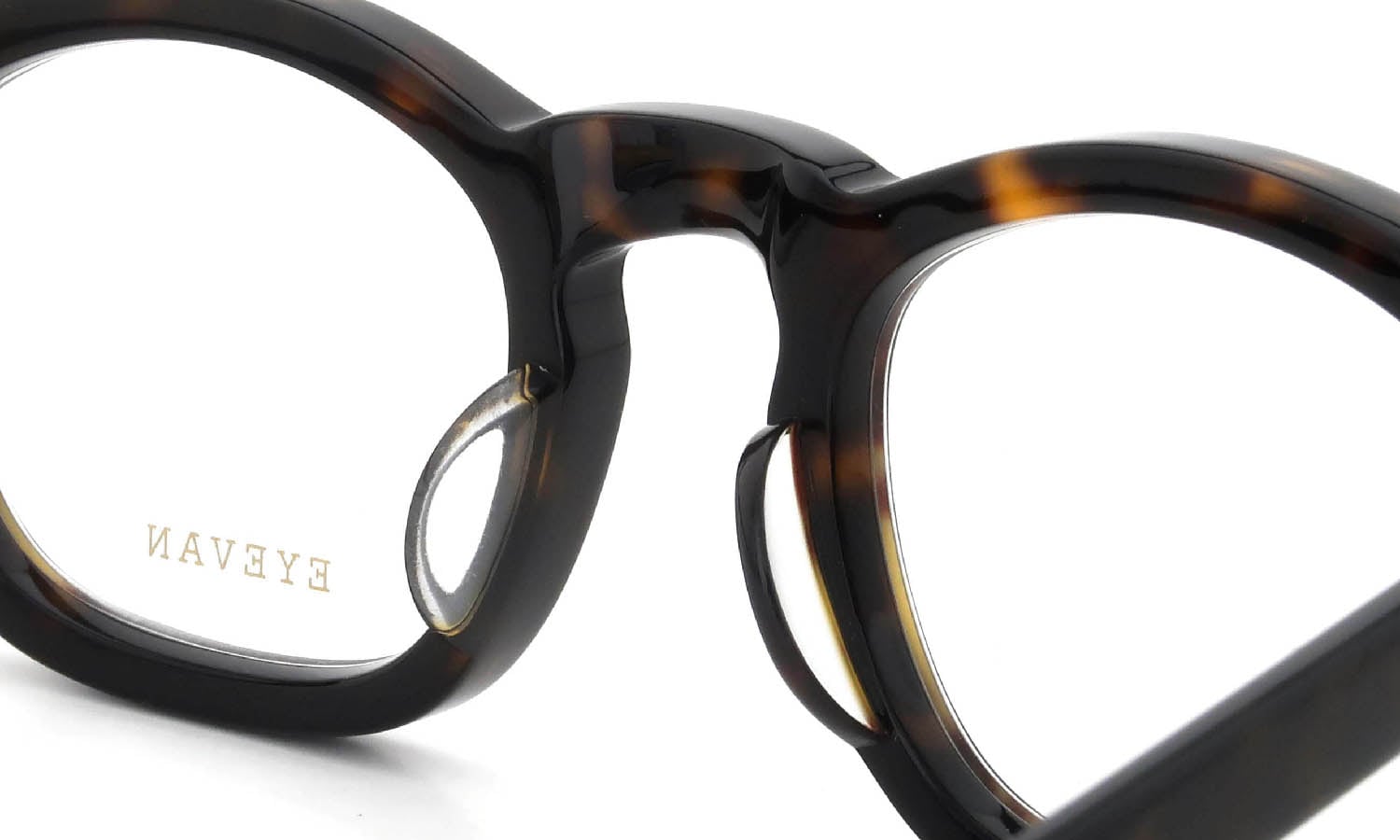 フレンチヴィンテージから着想を得た、エッヂのある肉厚なフロントと極太なワイドテンプルをEYEVAN流にデザインしたモデル。フロント、テンプル丁番には、工場に眠っていたヴィンテージのサンプルに使われていた三角形の台座の丁番をEYEVANオリジナルで再現。カシメPINには90年代に使われていた抜けを防止する補強パーツを使用。シンプルながら細部にもこだわった。