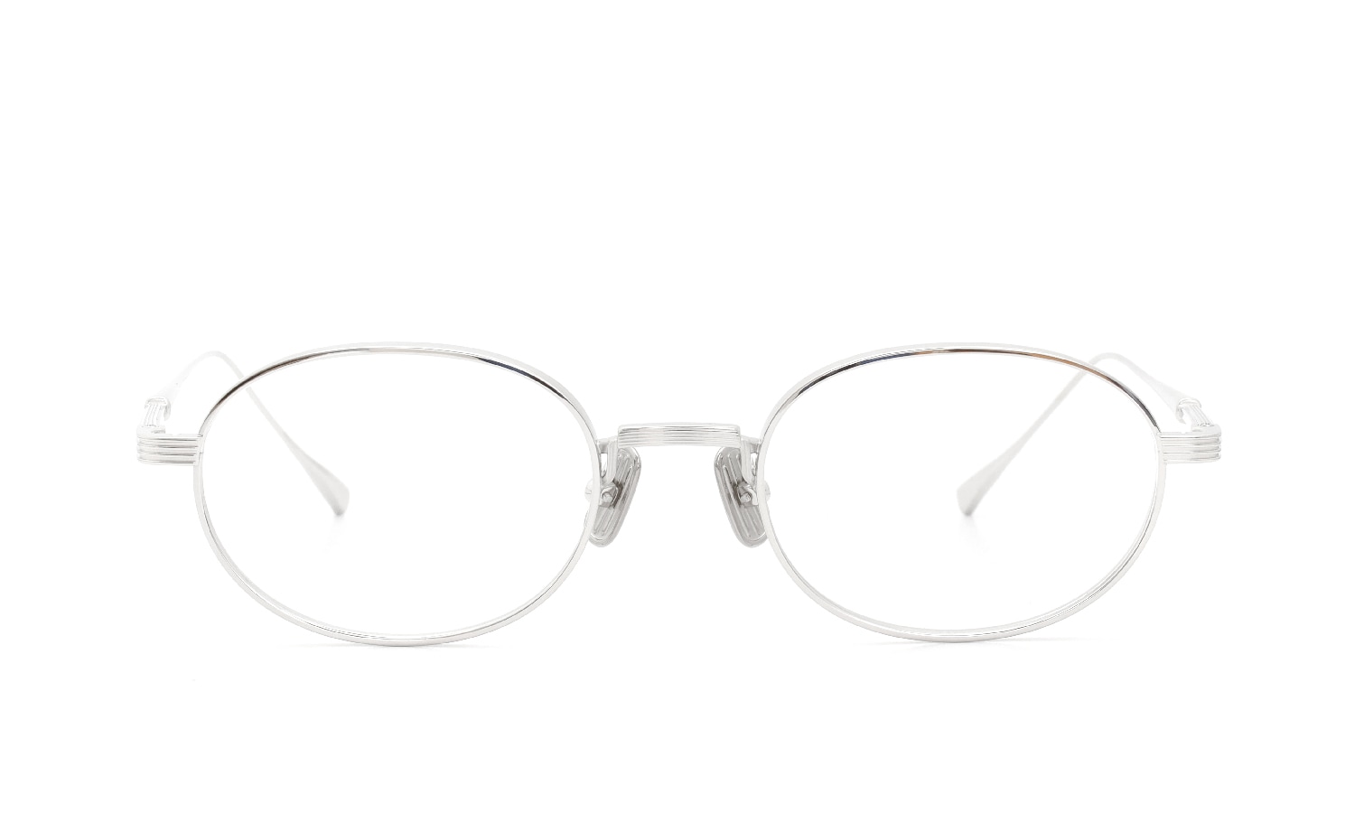 メカニカルな機構とともに金属の質感が魅力のオーバルシェイプのメガネフレーム。