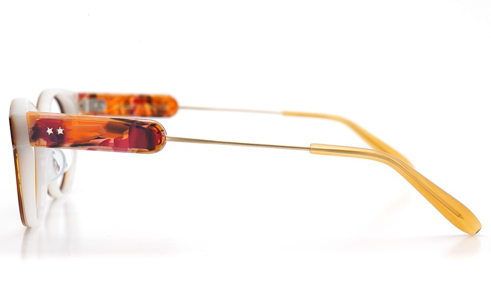 メタルがアセテート生地を挟み込むような独特の形状は、メガネアンドミーならではのポップさと