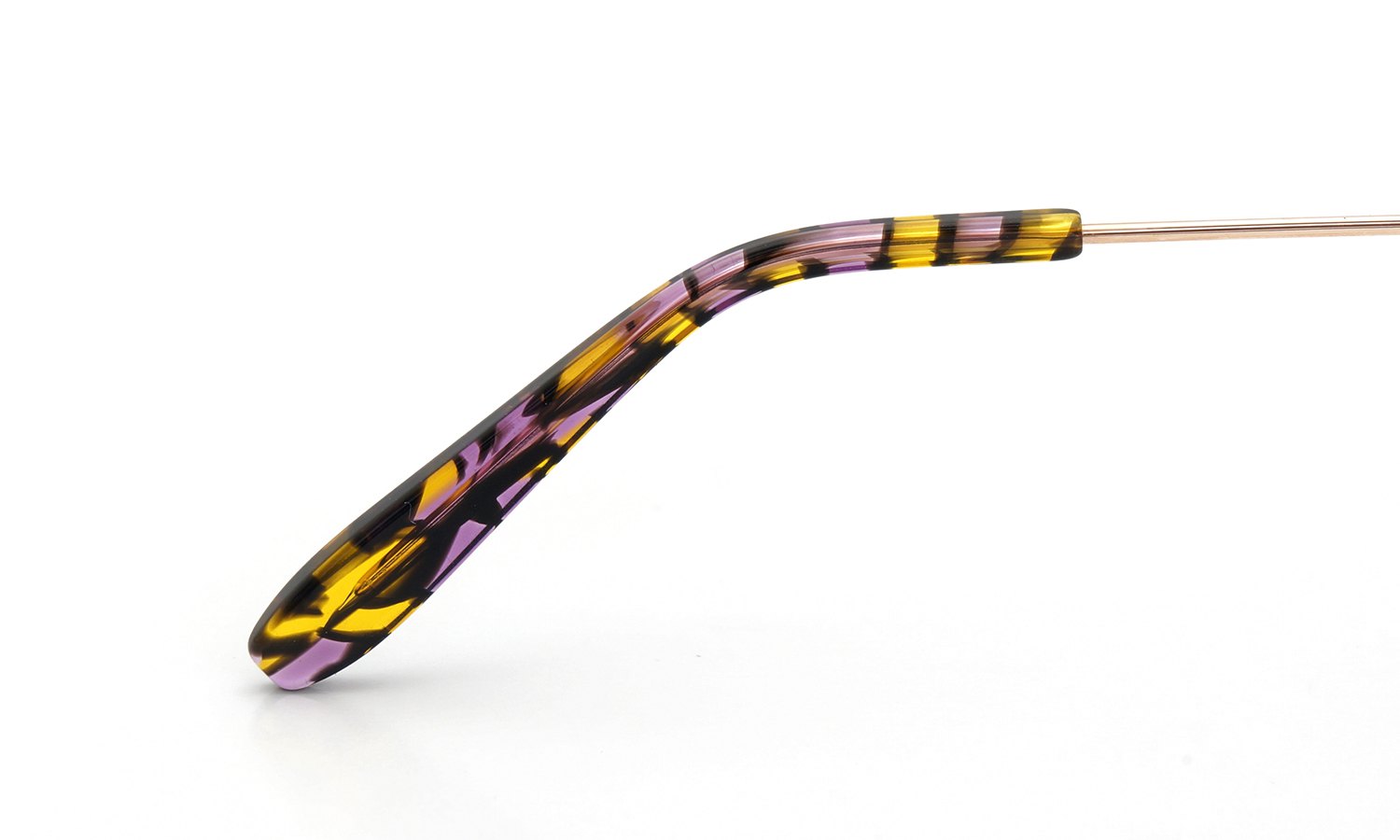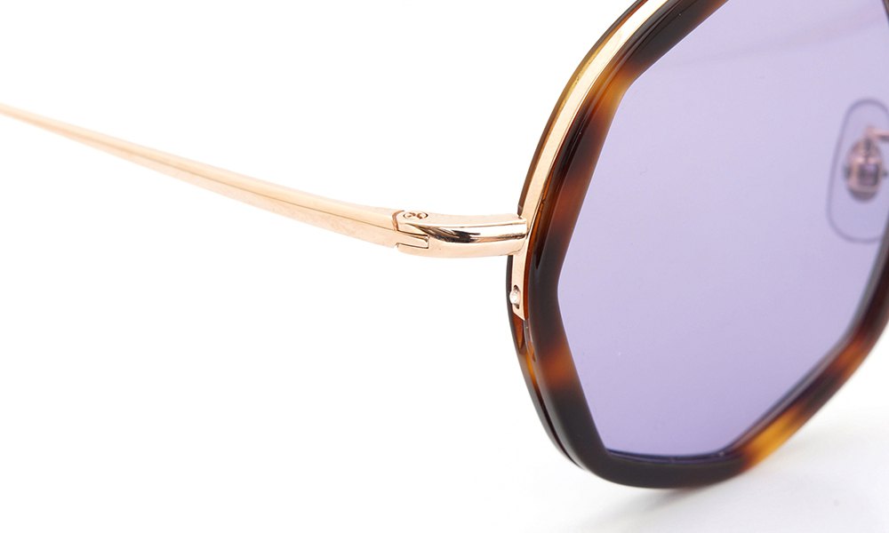 角を落とし気味にしたフレームシェイプと、角のエッジ感を残したレンズシェイプの組み合わせにより、幾何学的なポップさを落ち着いた雰囲気のあるメタルフレームが覆うという、華やかさと落ち着きの共存する大人なデザインになりました。