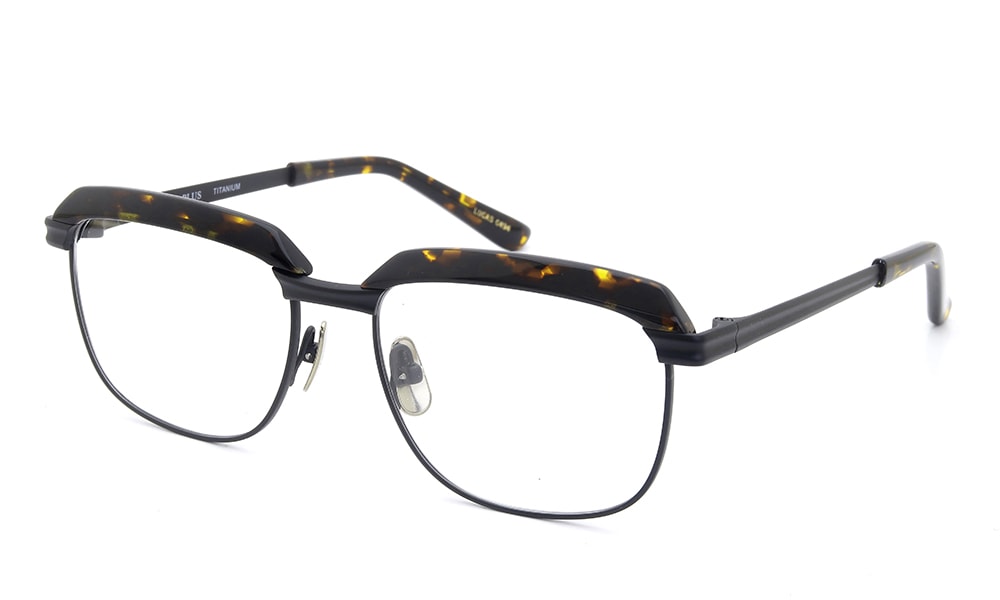 四角くいレンズにブロウパーツ、フロントからテンプルへつながるラインのデザインなどメンズライクな仕様。