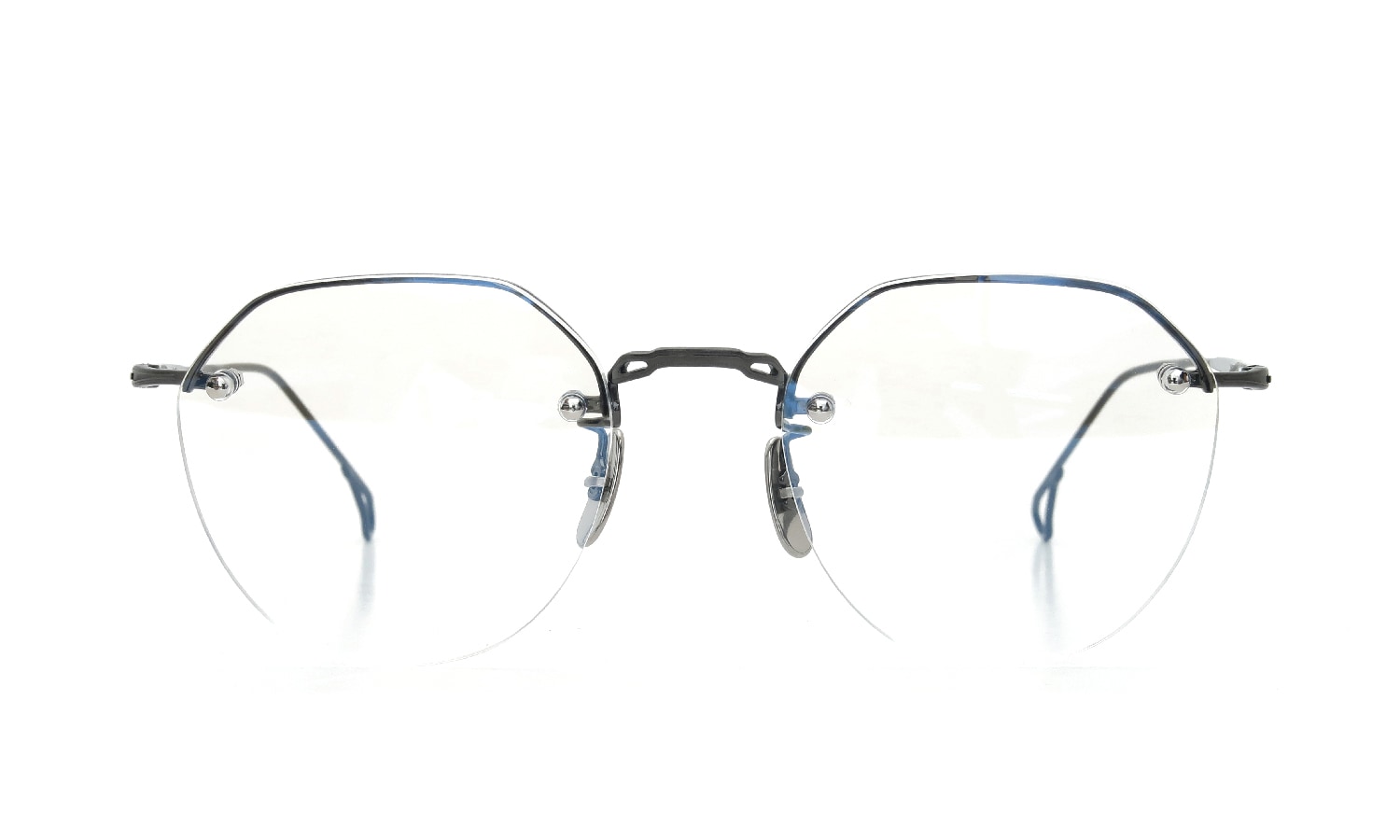 ブロウラインのレンズ背面にメタルパーツを這わせた構成。