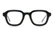 ツートンカラーのアセテートフレーム。 フロントのリム周り、テンプルのフロント側半分がクリアの濃いネイビー。フロント全体とテンプルの先がブラックという組み合わせ。 ガッシリとしたウエリントンながら、ブロウラインを智の部分で落とすなど、一筋縄ではいかない凝ったデザインです。 テンプルの芯金に施されたデザインも美しく、ボリューム感と緻密さが同居するセルフレーム。