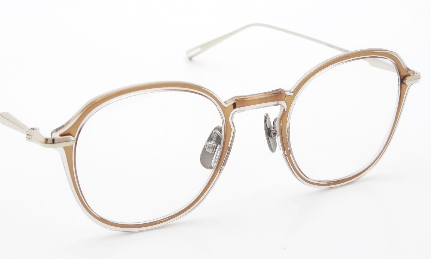 フロントカラー:表がライトブラウンで裏がクリア生地のアセテートの中にブラッシュ加工を施されたシャンパンゴールドのシートメタルが封入