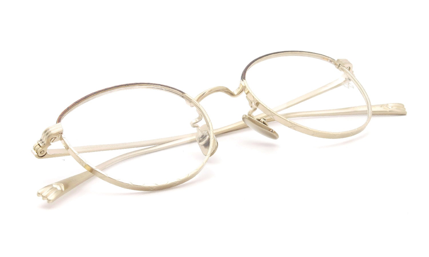 シャーリングが施されたライトゴールドのメタルをベースに、上リムにはダークブラウンの樹脂が塗装されており、