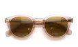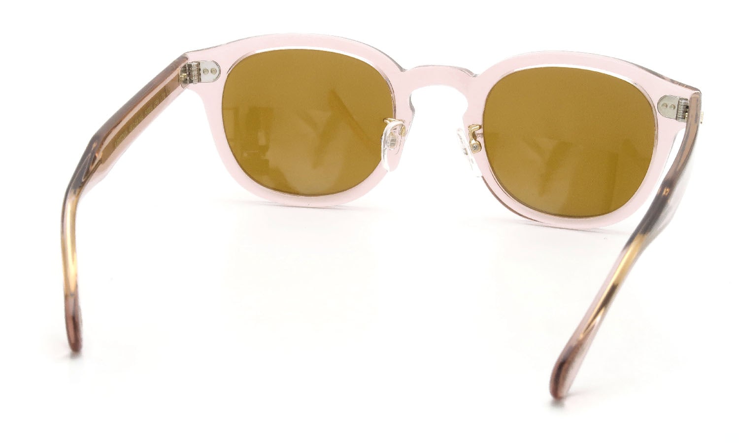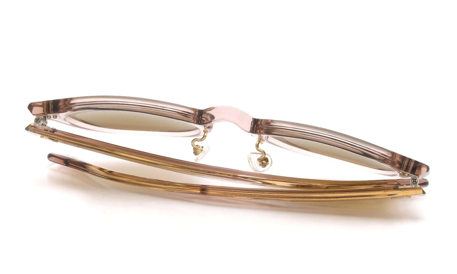 クリアピンクのフレームにブラウンのガラスレンズの組み合わせ。