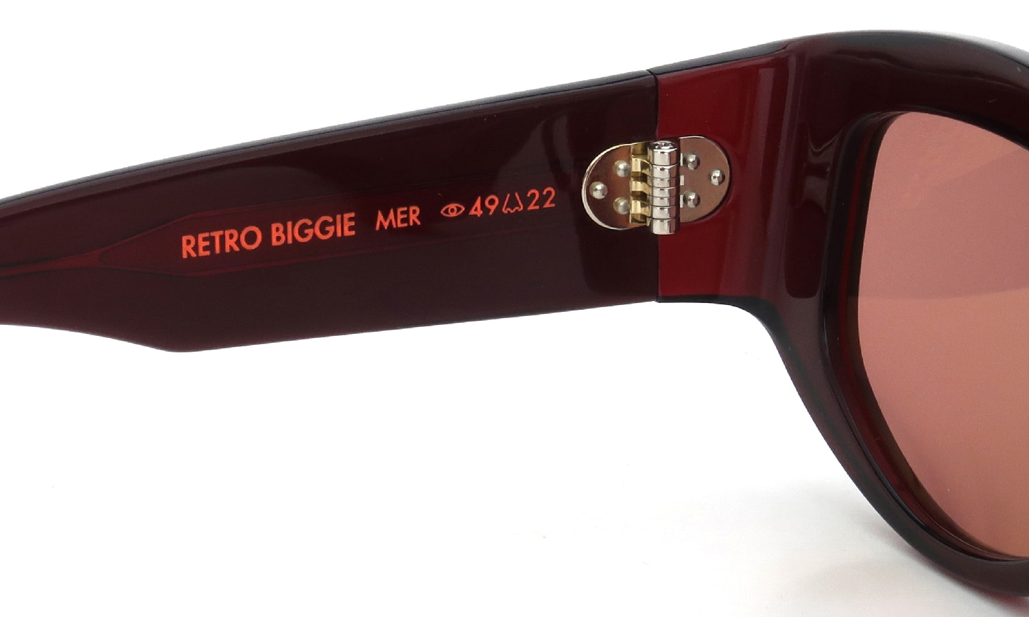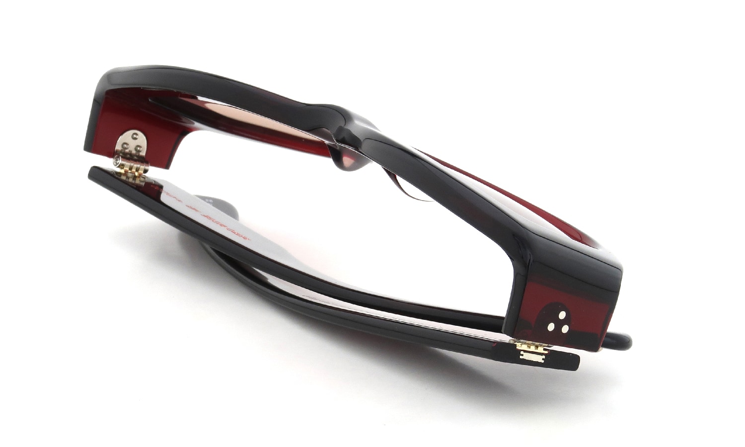 縦幅のある智に3点カシメをフロントとテンプルそれぞれに施した特徴のあるヒンジの造形など