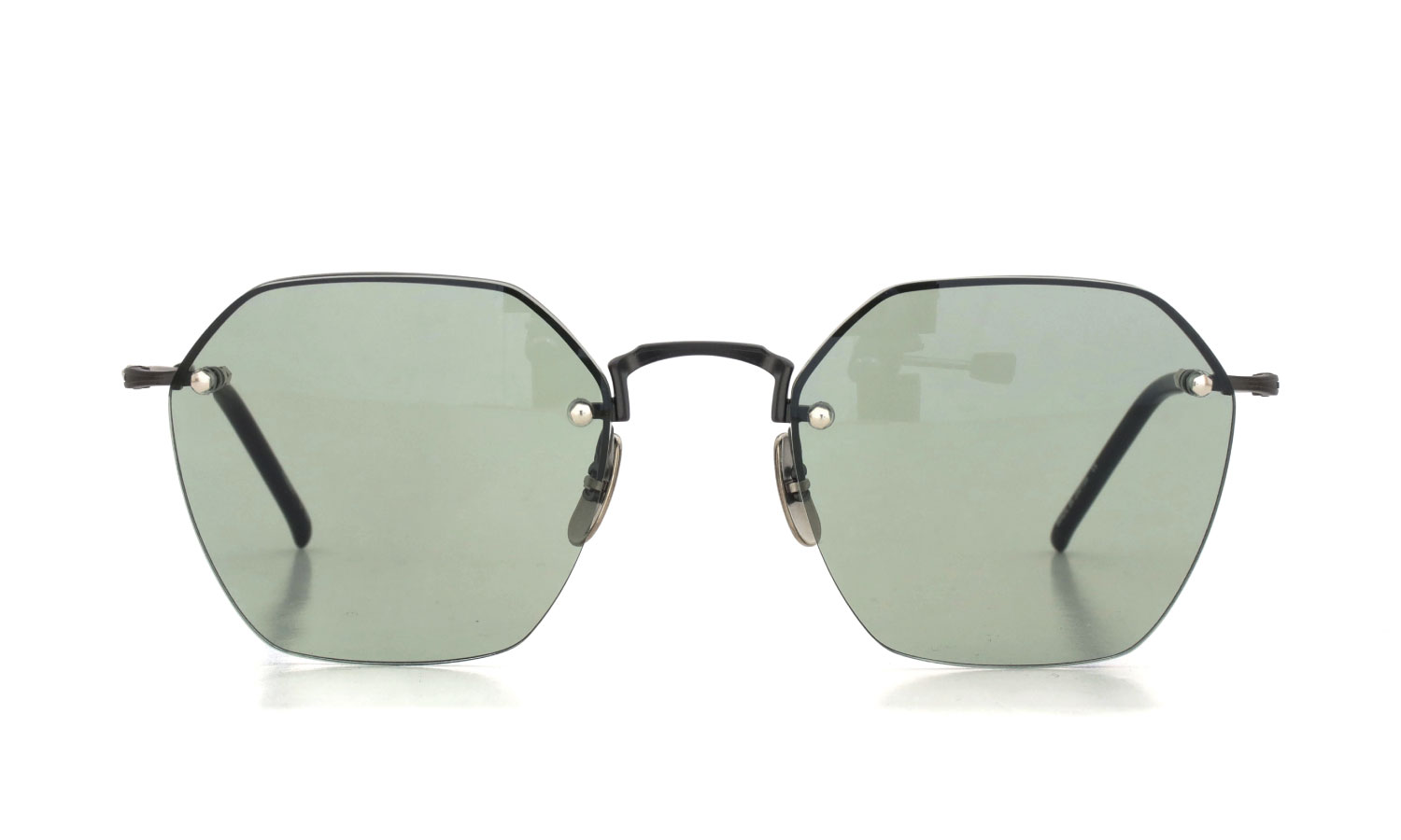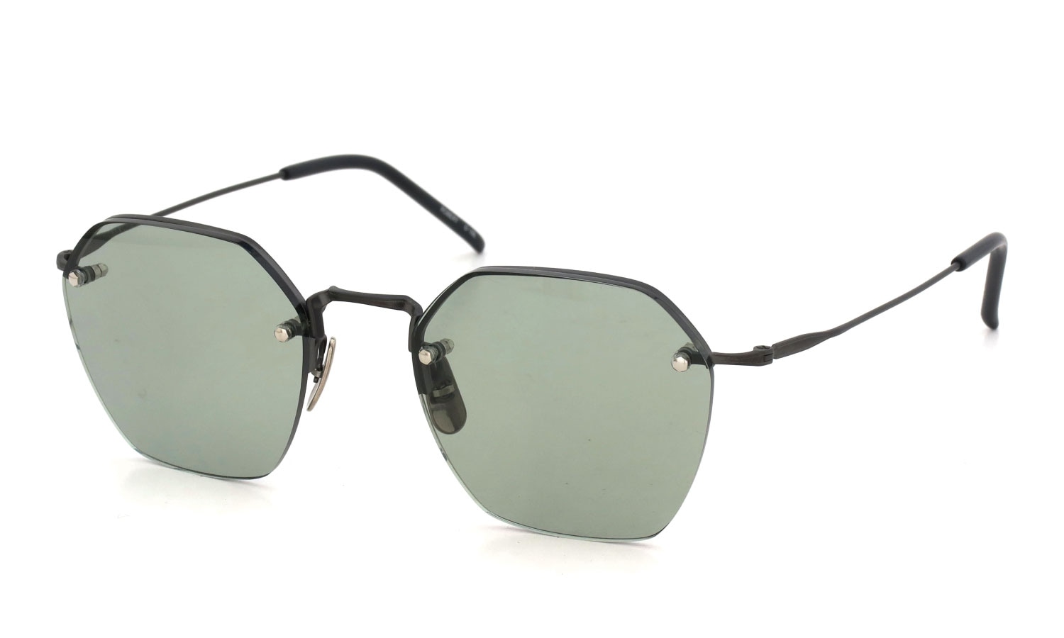 レンズの裏側に金属パーツを這わせたリムウェイの構造をもつ、六角形のツーポイントフレーム。