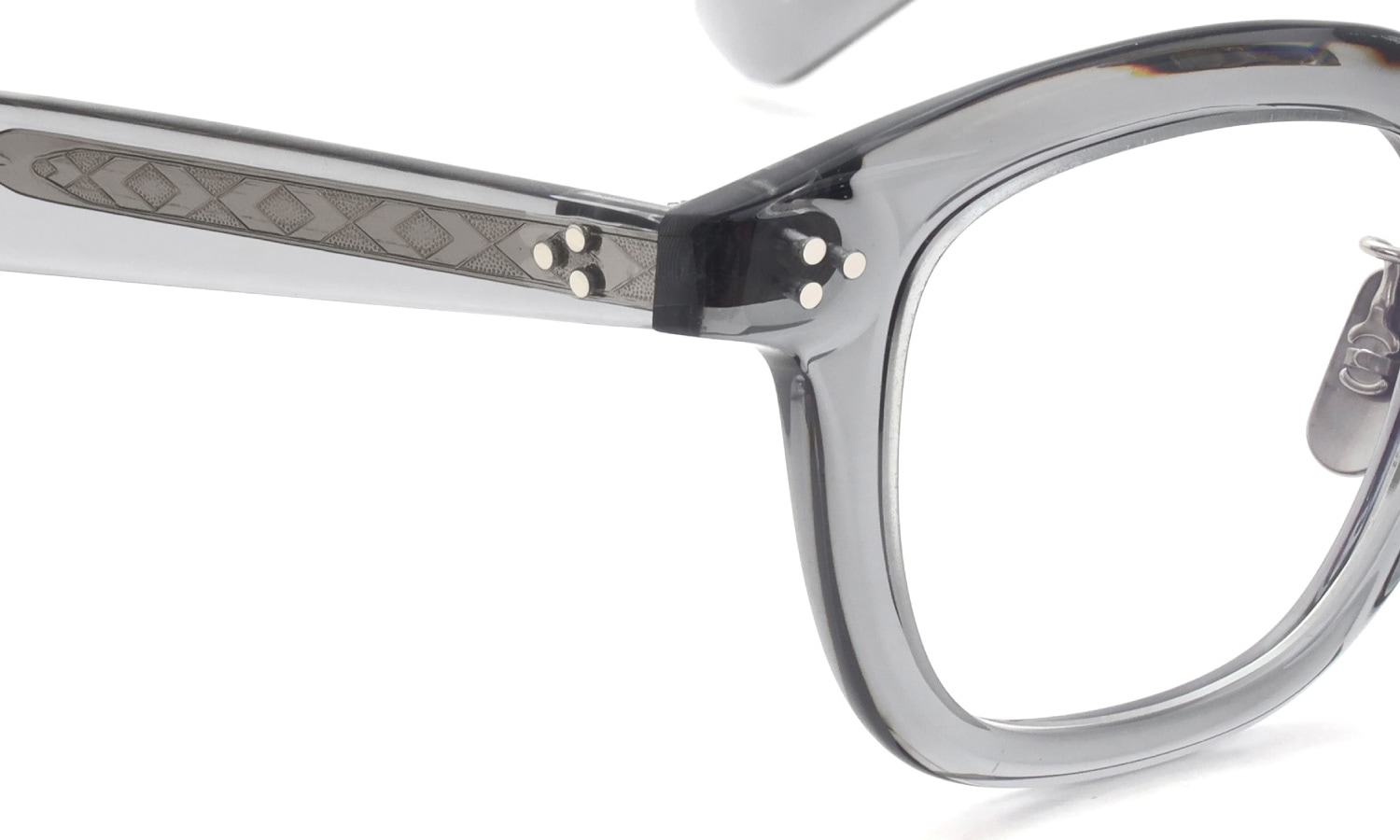 角ばったレンズの形状、テーパー処理を施した伸びやかなブロウラインに小ぶりな3点カシメ鋲の組み合わせ。