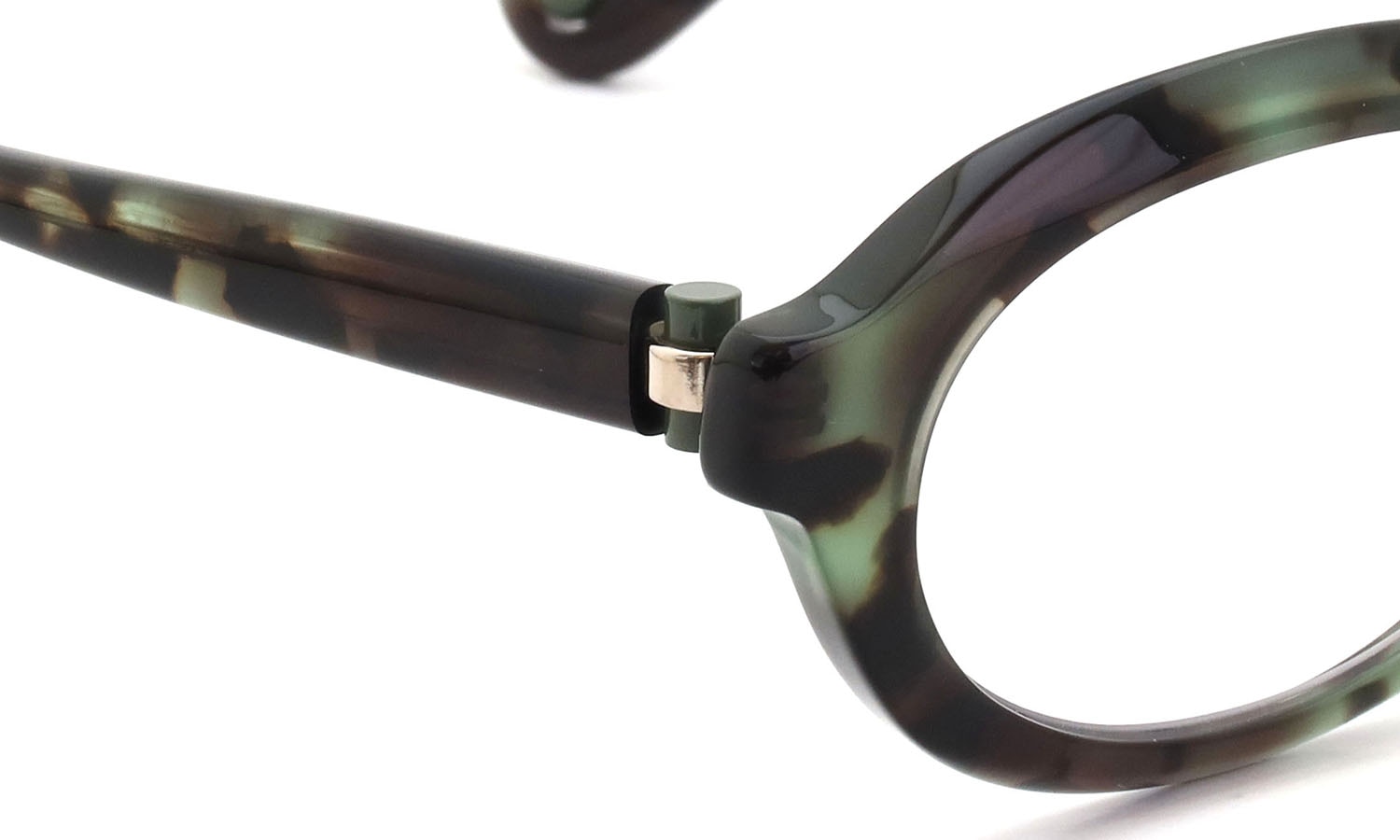 カラーメタルを用いた円筒形のヒンジの機構や、テンプル先に埋め込まれた球体モチーフなど