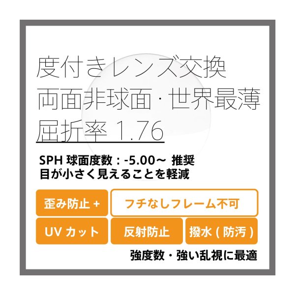 度付き世界最薄レンズ・両面非球面(通常納期・約1週間) [1.76 反射防止コート/UVカットコート/防汚コート/ツーポイント・ナイロール非対応]